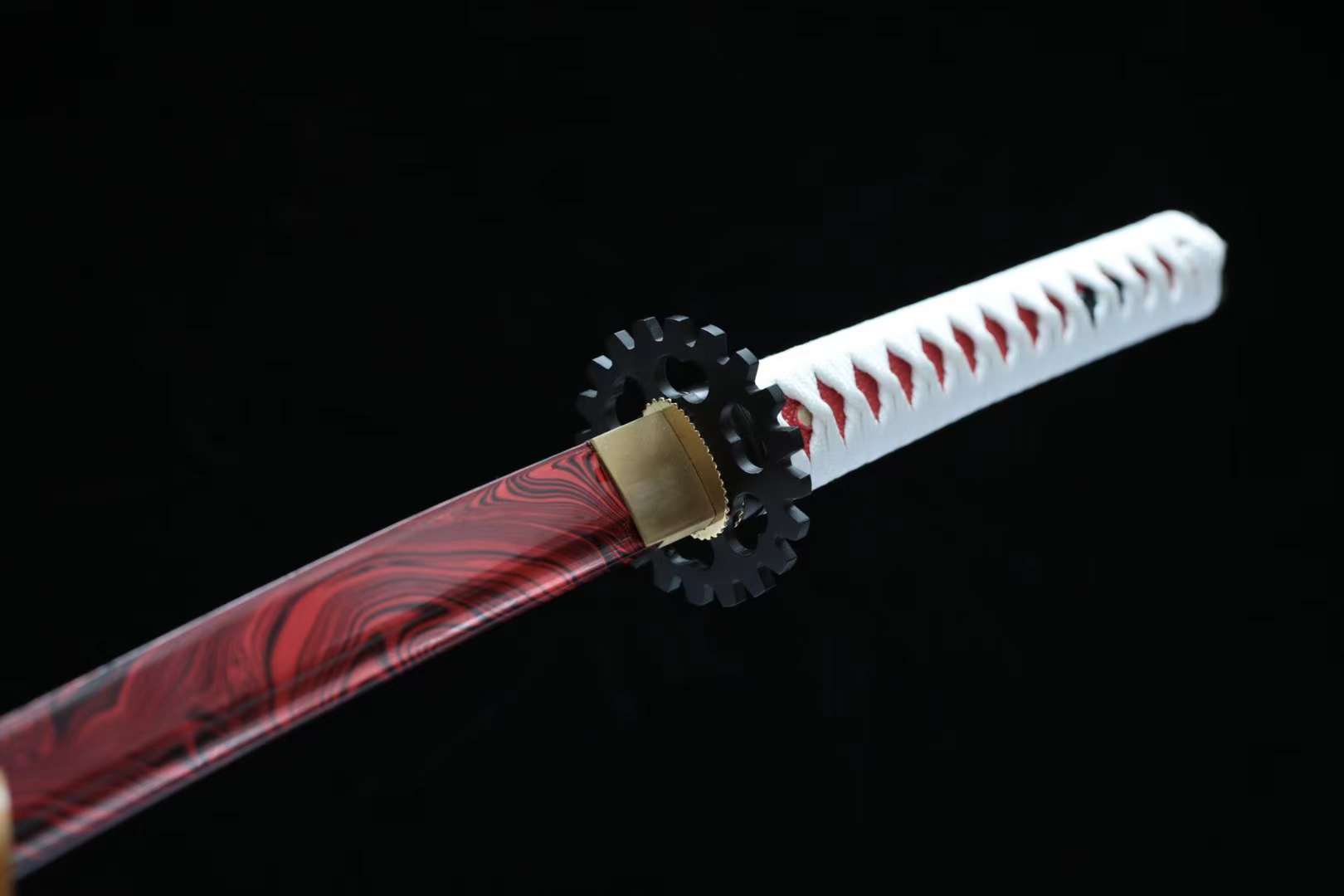 Garde (Tsuba 鍔) : La tsuba en fer, en forme d'engrenage, apporte une touche industrielle à ce design par ailleurs traditionnel, évoquant le mouvement et la puissance. Sa finition noire brillante contraste magnifiquement avec le rouge flamboyant de la lame.