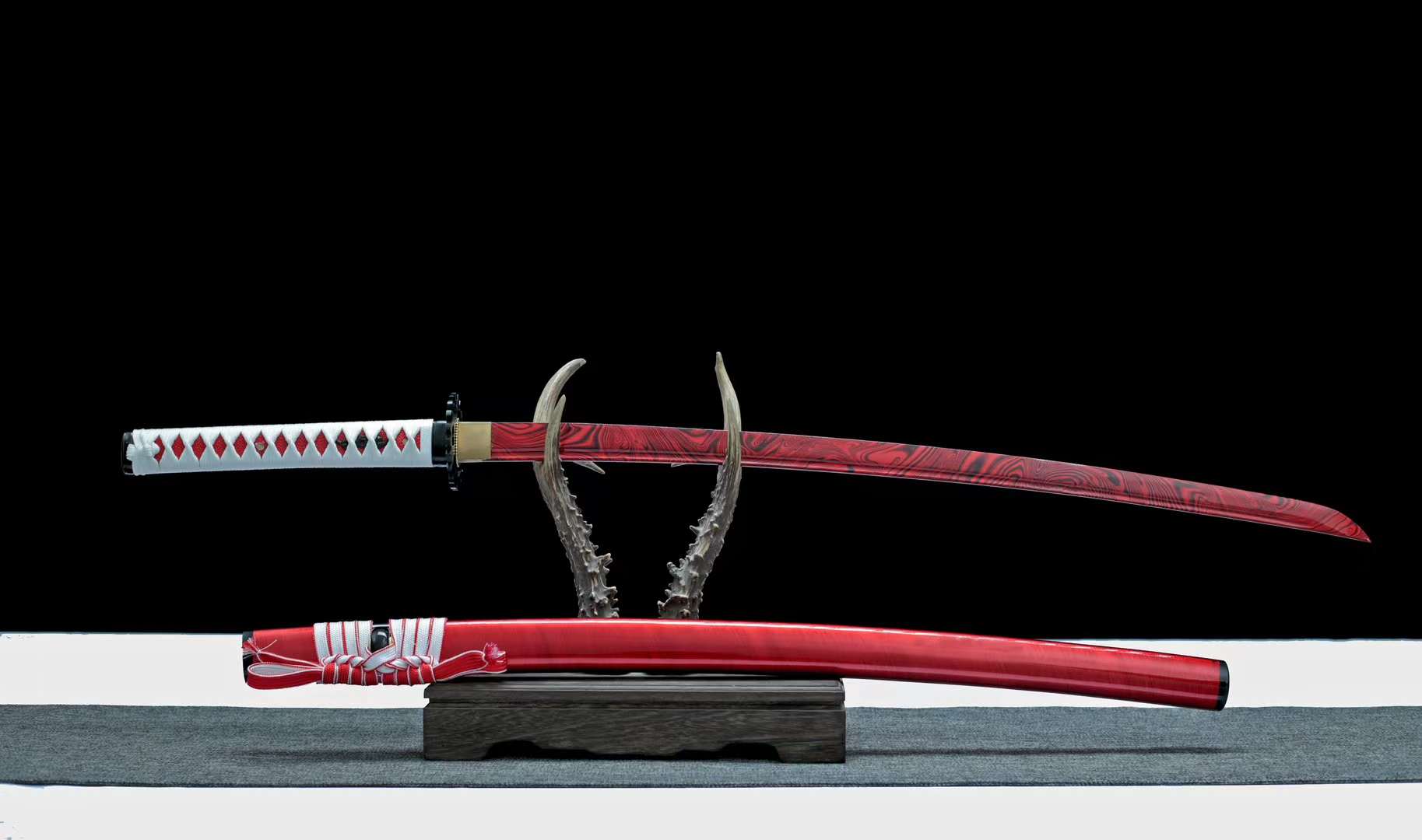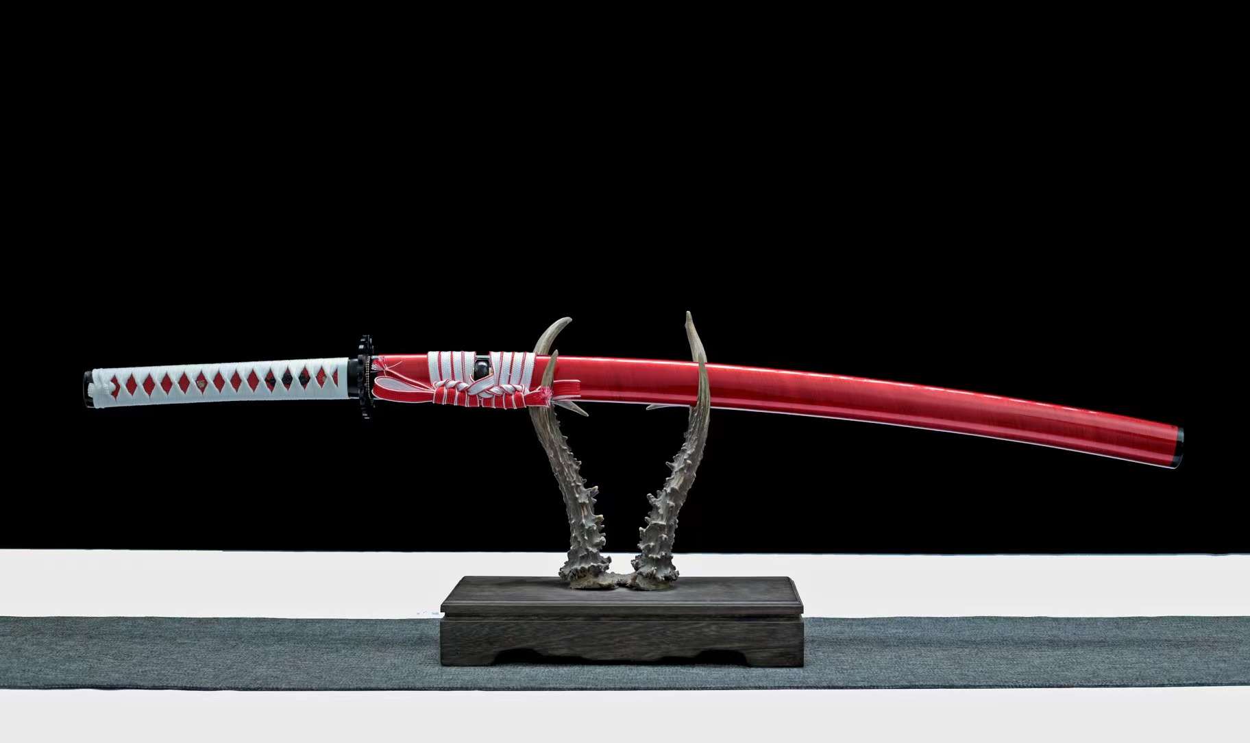 Fourreau (Saya 鞘) : Le saya rouge laqué complète l'ensemble, fermé par un cordon sageo blanc et rouge assorti qui rehausse l'esthétique vibrante du katana.