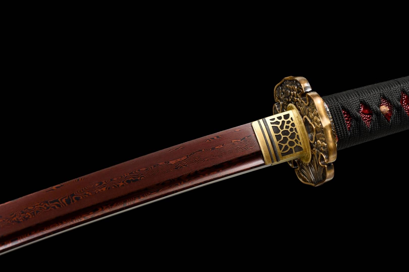 | Garde (Tsuba) Tsuba en cuivre sculpté représentant des motifs de sakura et de vagues. Tsuba (Tsuka) Tsuba en cuivre sculpté représentant des motifs de sakura et de vagues. Fourreau (Saya) Saya rouge foncé texturé cuir avec motifs de vagues en relief et cordon sageo noir. Poignée (Tsuka) Ito en soie noire. Enveloppe en samegawa rouge foncé (peau de raie) avec ornements en laiton |