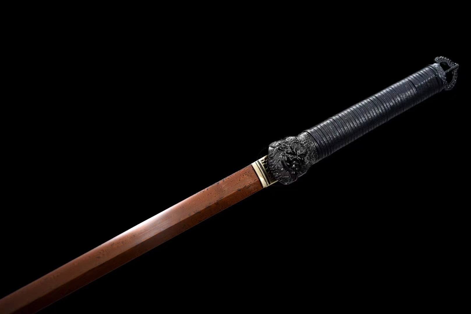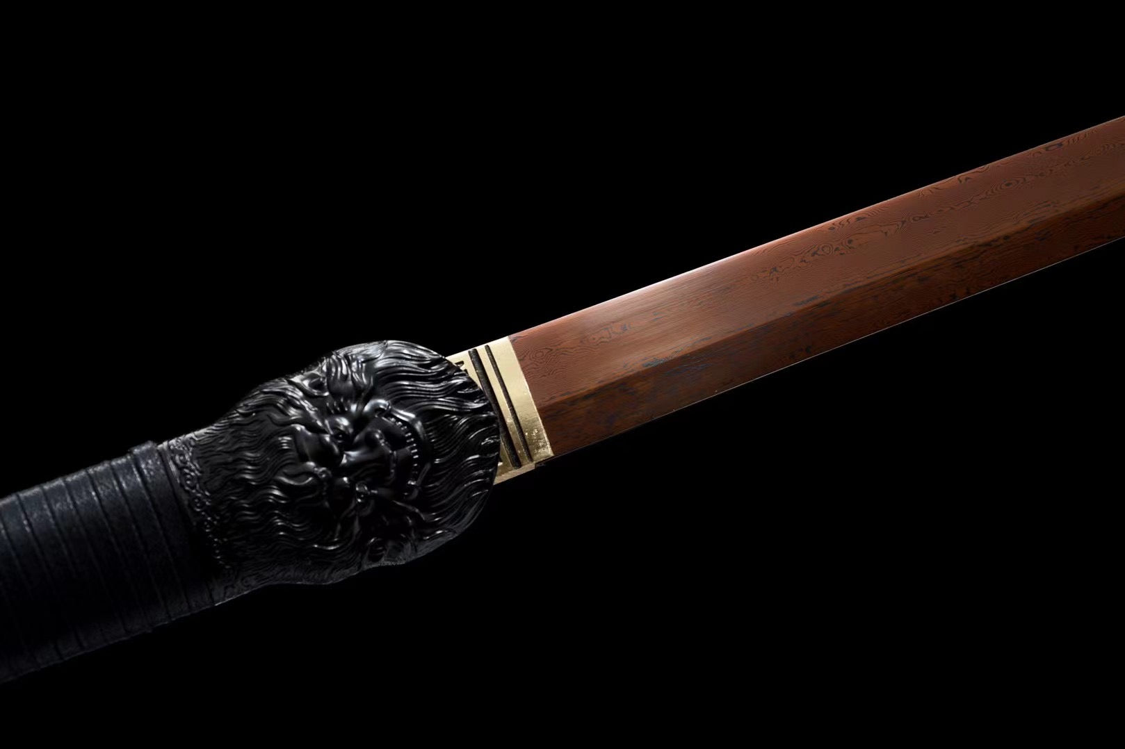 Le Akaryū Ninjatō se distingue par sa rare lame en acier damassé rouge, symbolisant à la fois le feu et la puissance. Son fourreau sombre contraste élégamment avec la teinte chaude de l'acier, tandis que la garde en forme de lion ajoute une aura de force et de domination. Cette pièce capture l'équilibre entre énergie brute et savoir-faire raffiné, ce qui en fait un ajout remarquable à toute collection.
