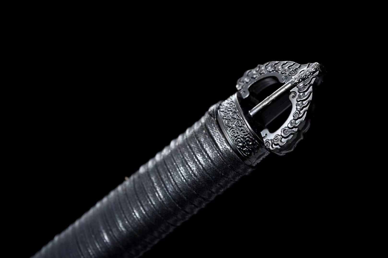 | Poignée (Tsuka 柄) : Recouverte d’un cordon en cuir noir avec un embout détaillé représentant la crinière du lion. |