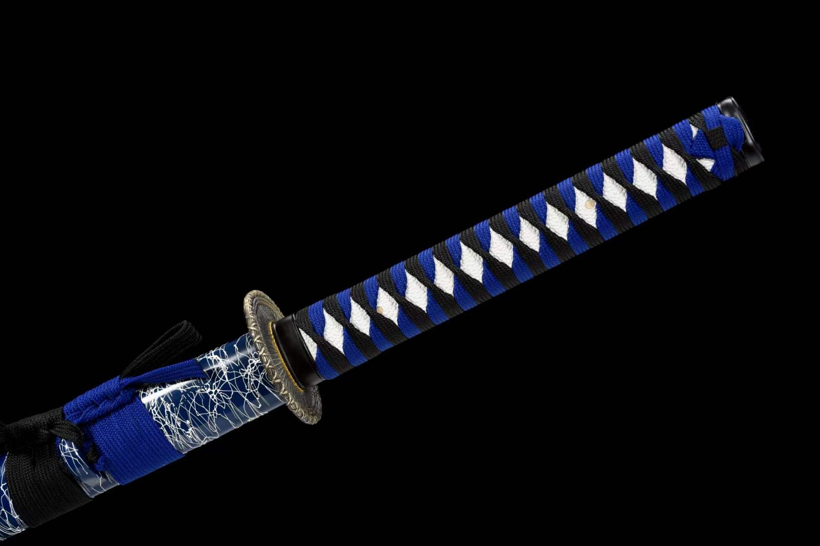 Fourreau (Saya 鞘) — Avec sa finition laquée bleue et sa texture marbrée blanche, le saya confère au sabre une touche japonaise à la fois moderne et traditionnelle.