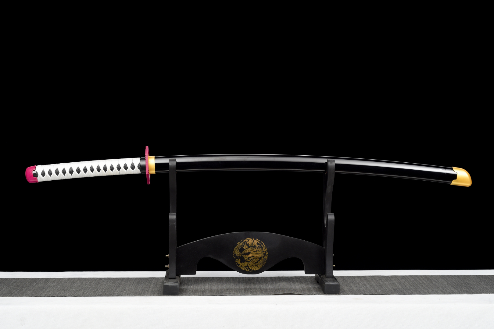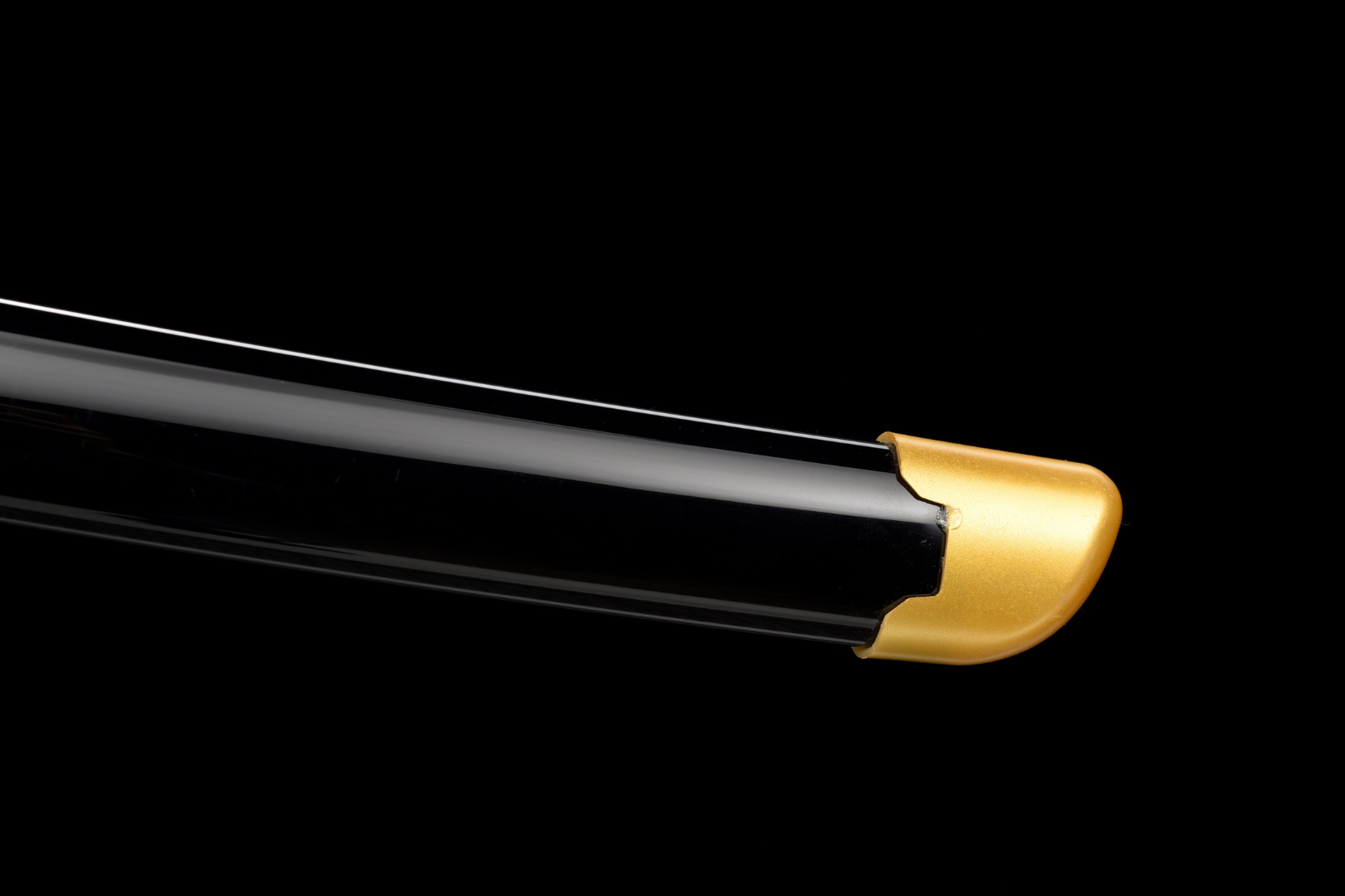 Fourreau (Saya 鞘) — Finition laquée noire brillante avec un capuchon doré pour une esthétique luxueuse.