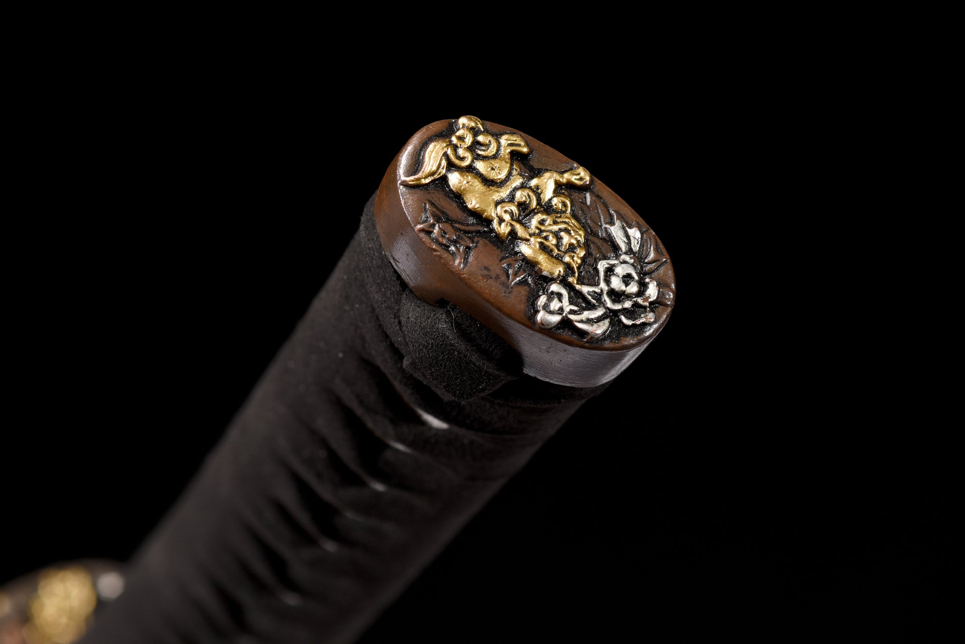 Ito en coton noir sur peau de raie blanche (samegawa) Menuki et fuchi-kashira en cuivre à motifs floraux en relief |