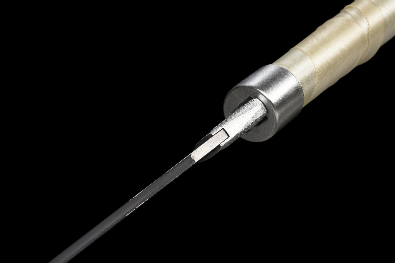 Poignée (Tsuka 柄) — Revêtement ivoire sur peau de raie synthétique pour une prise en main sûre et confortable ; fixée par deux mekugi en bambou et ornée de menuki en fer.