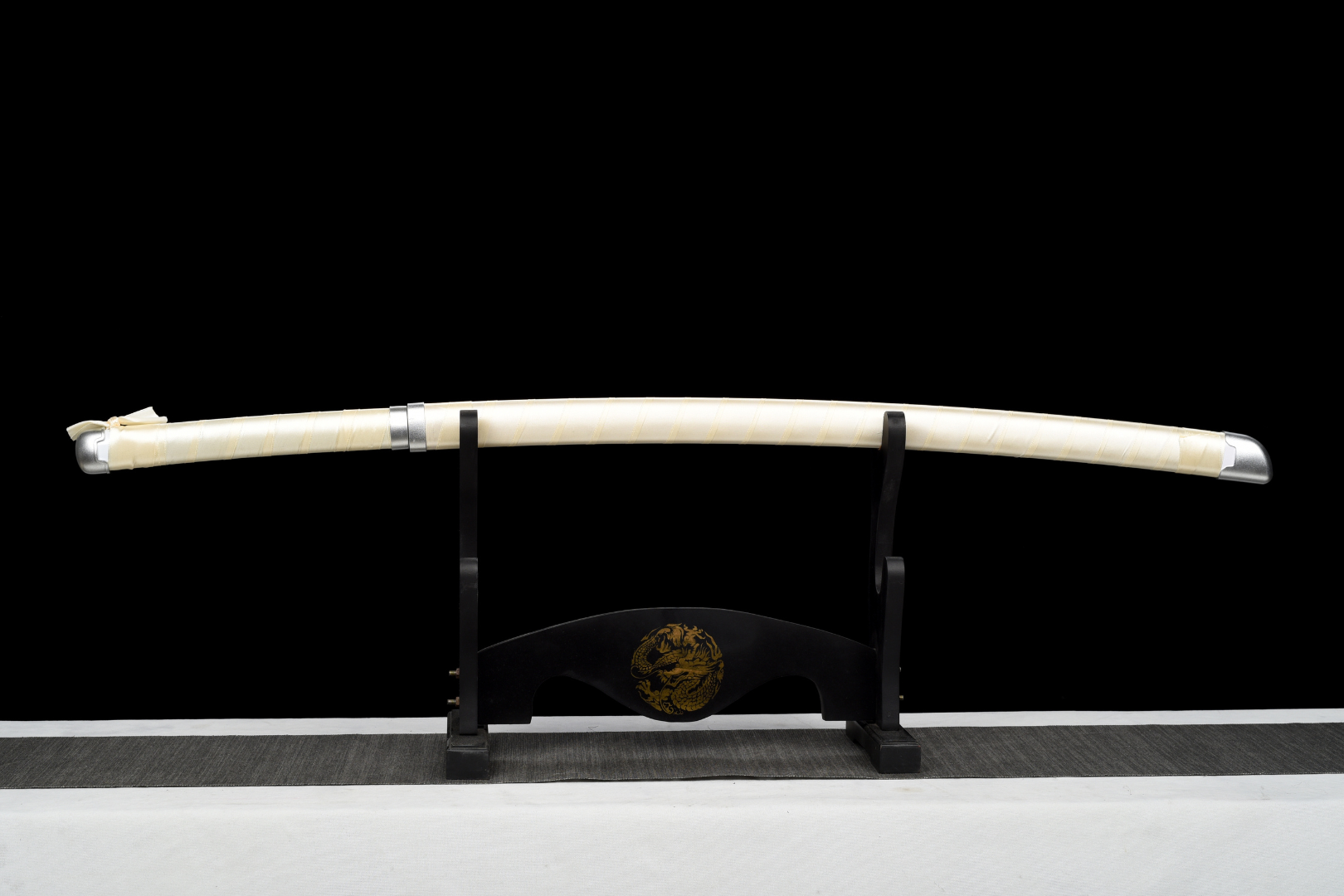 Fourreau (Saya 鞘) — Bois laqué blanc mat minimaliste, contrastant avec la robustesse de la lame. Lame.