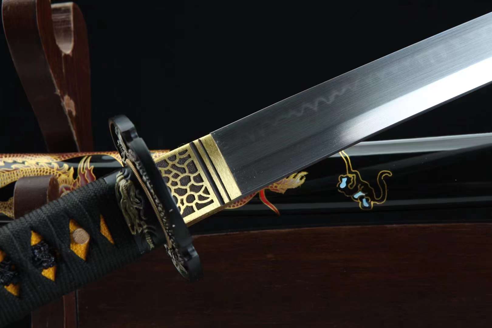 Garde (Tsuba 鍔) : La tsuba est ornée d'un dragon finement sculpté en mouvement, emblème intemporel de force, de prospérité et de vigilance. Finition en alliage noir vieilli avec des reflets dorés.