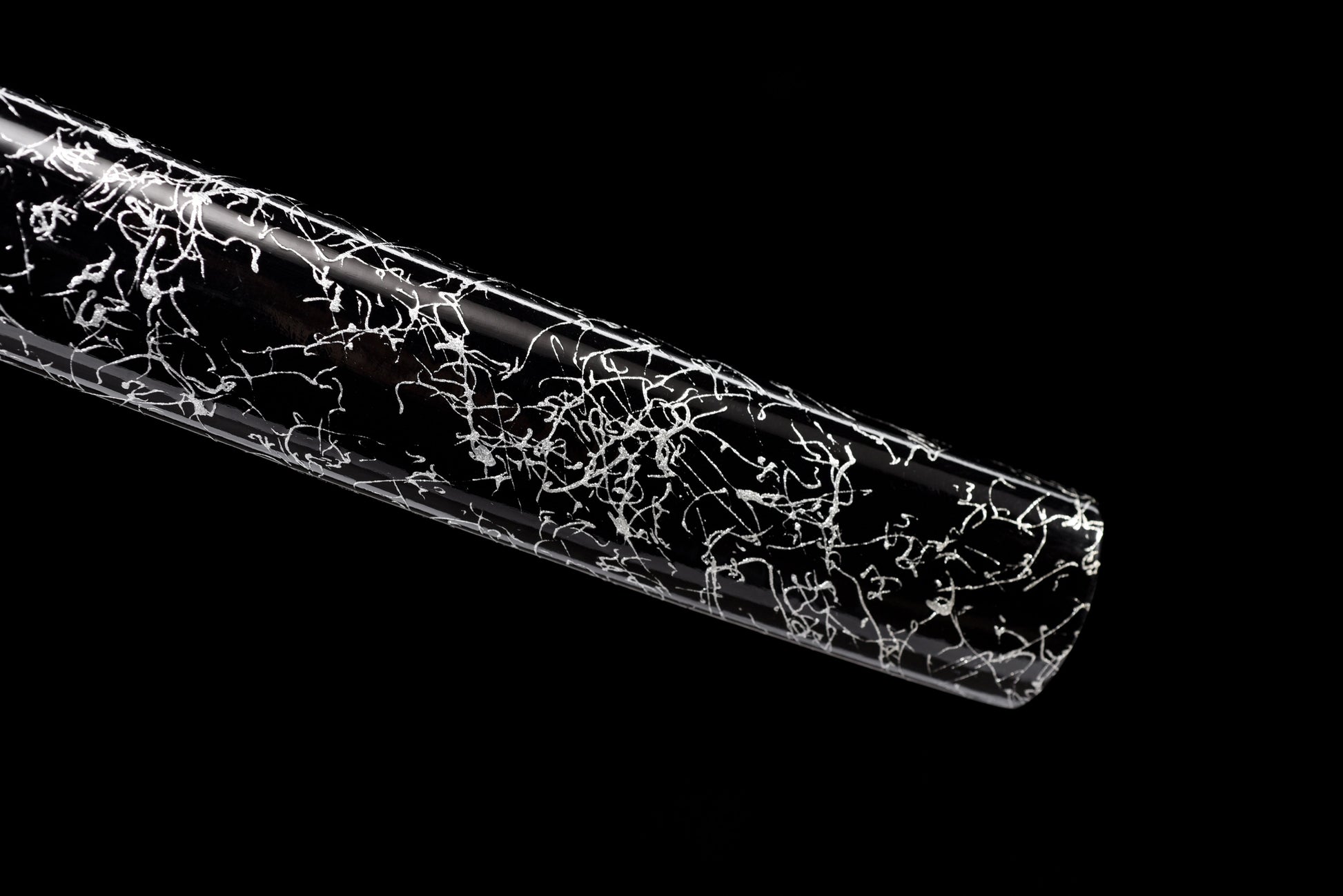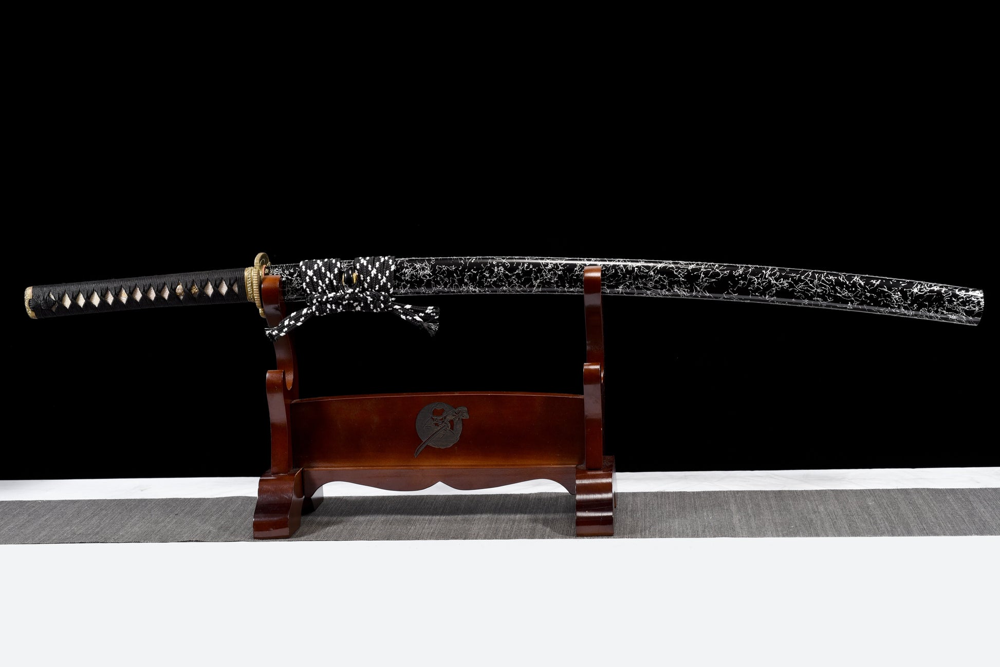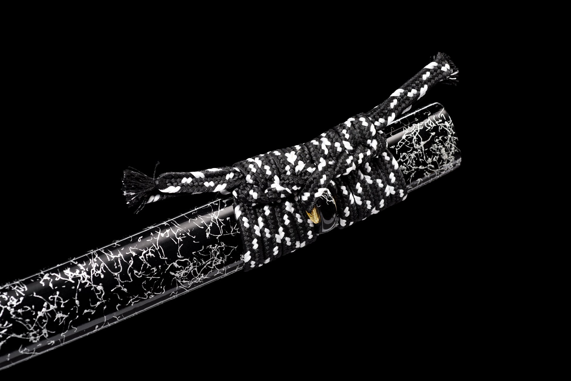 Fourreau (Saya 鞘) : Le saya noir laqué de marbre blanc évoque l'encre sur le papier — un design poétique équilibré par le cordon sageo noir et blanc noué à la manière des samouraïs.