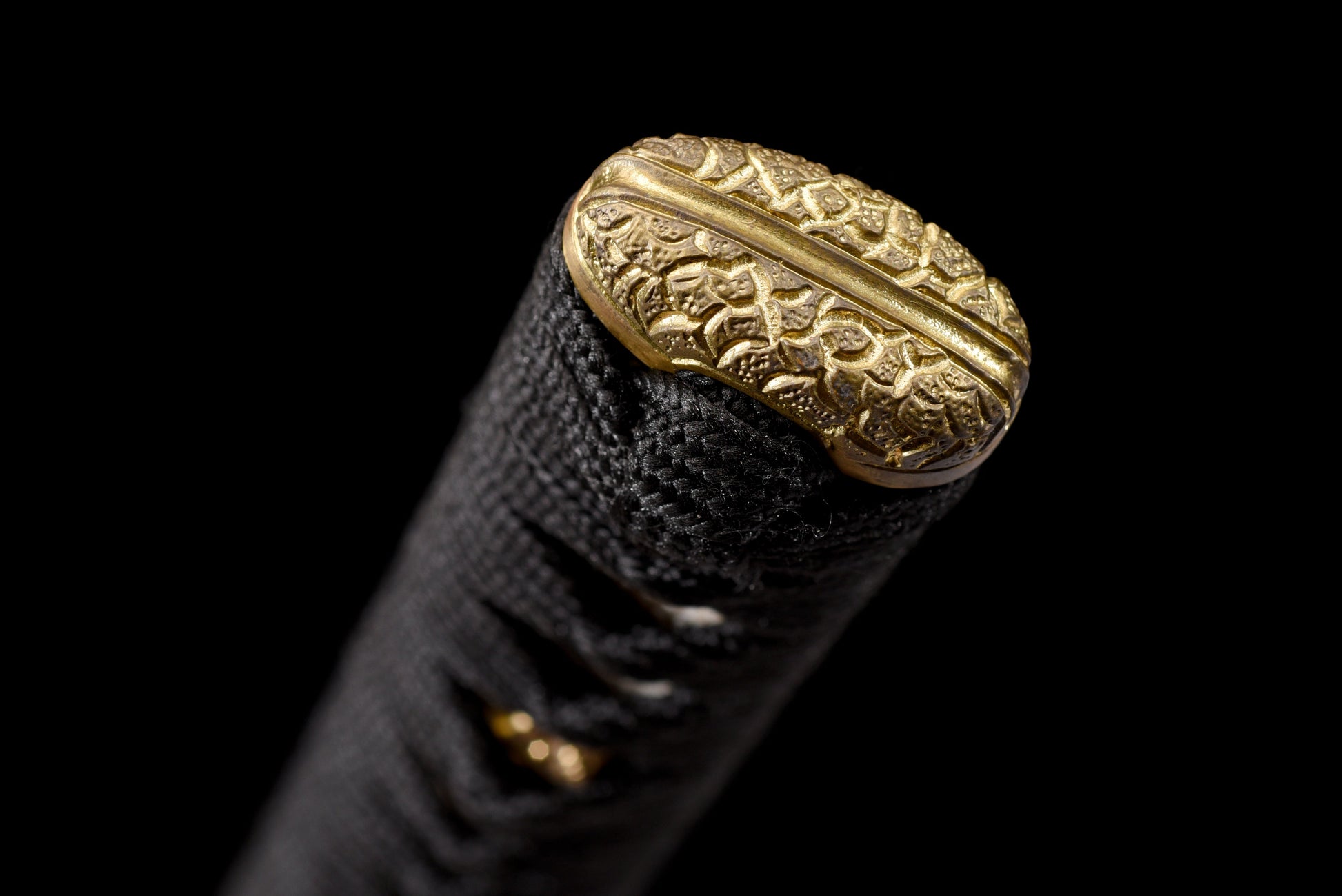 Poignée (Tsuka 柄) : Recouverte d'ito de coton noir sur du cuir de raie blanc véritable, la tsuka offre stabilité et contraste, avec des menuki dorés en forme de fleurs épanouies.