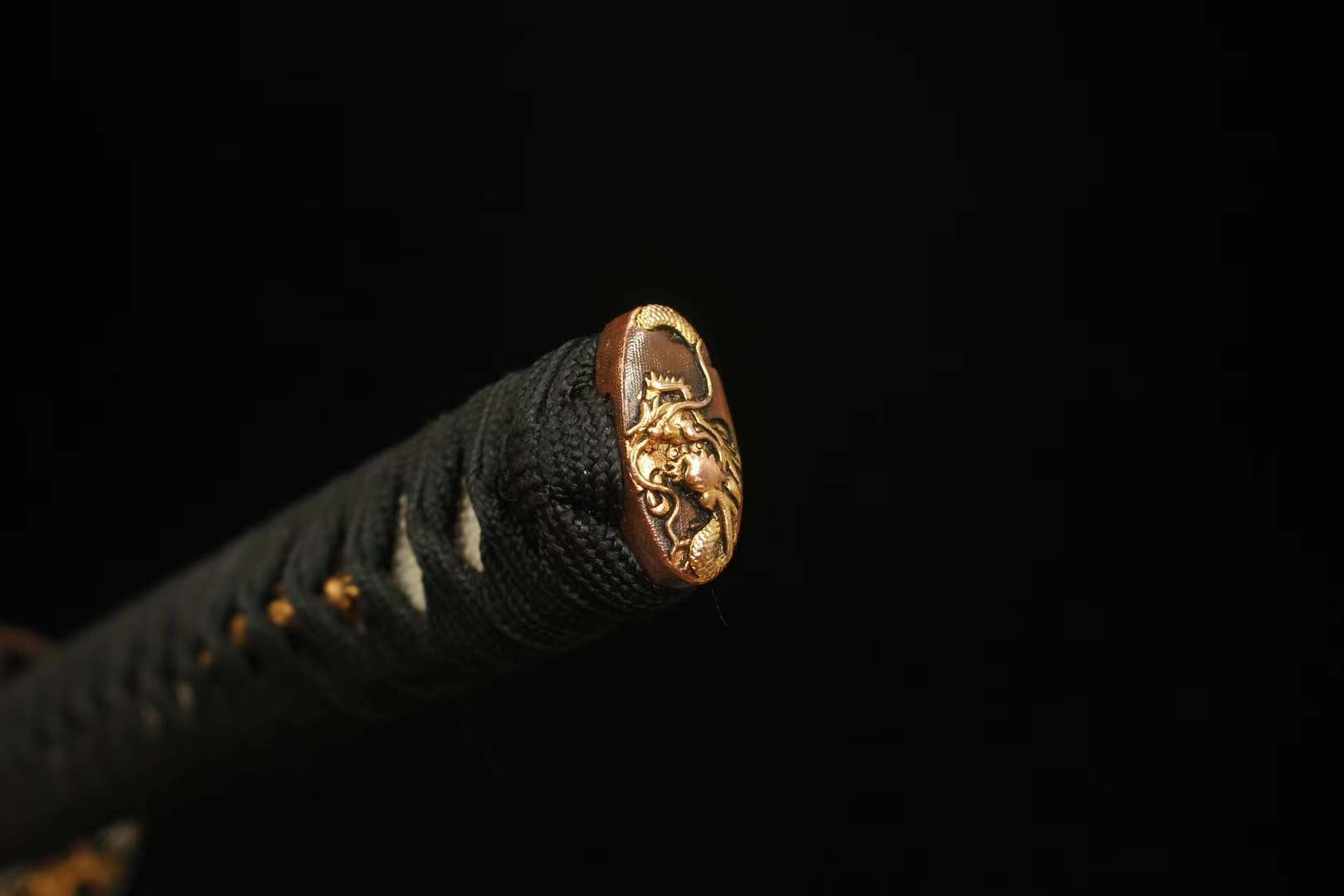 Garde (Tsuba 鍔) : La tsuba en cuivre sculptée à la main représente des dragons dorés entourant des fleurs épanouies, symbole de puissance et de grâce. Chaque détail est gravé et doré à la perfection, témoignant du savoir-faire japonais en matière de métallurgie.