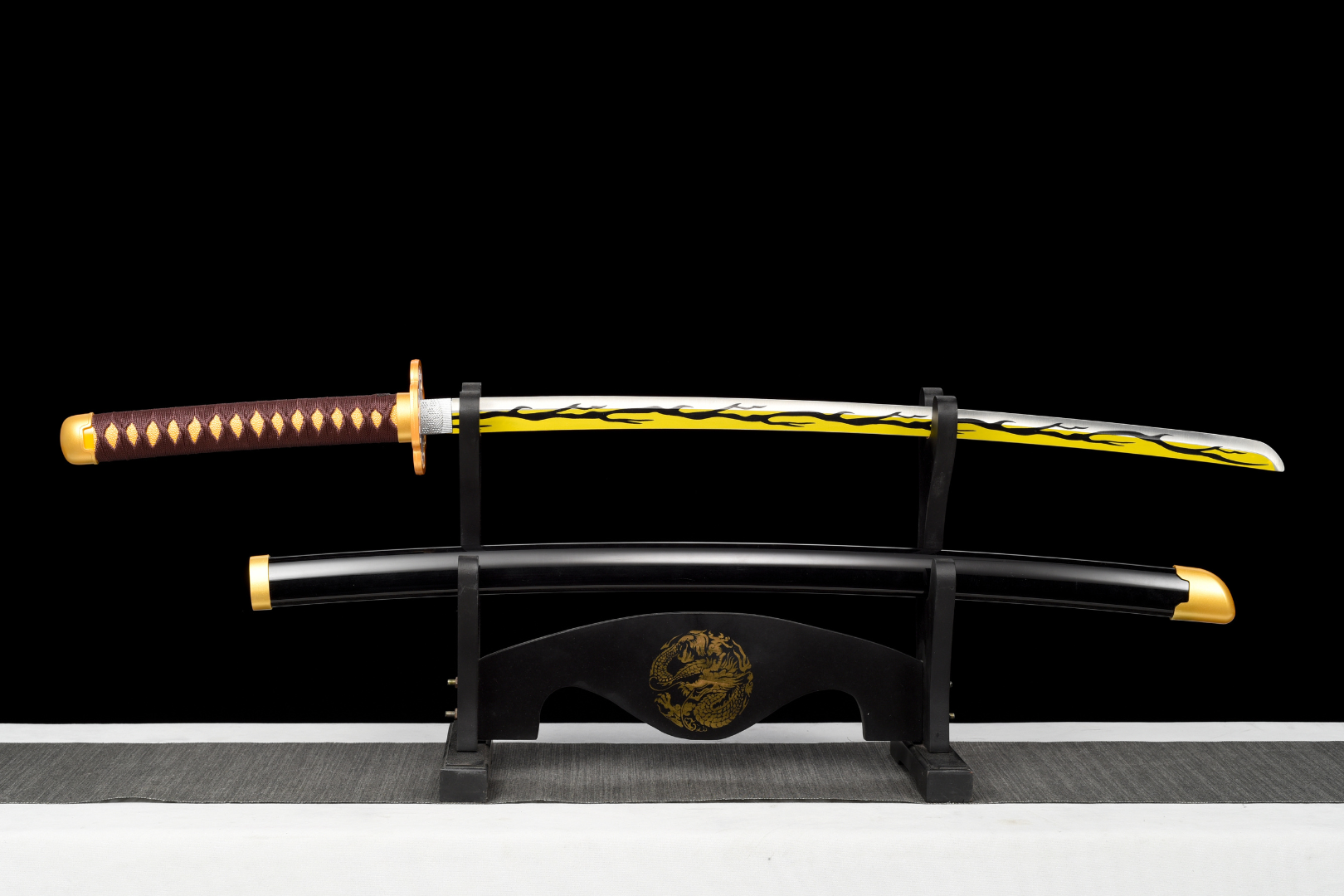 Lame (Kissaki 刃) — Forgée en acier au carbone 1060, cette lame jaune vif ornée de motifs de flammes noires reflète le style de respiration du tonnerre de Zenitsu et sa puissance explosive.