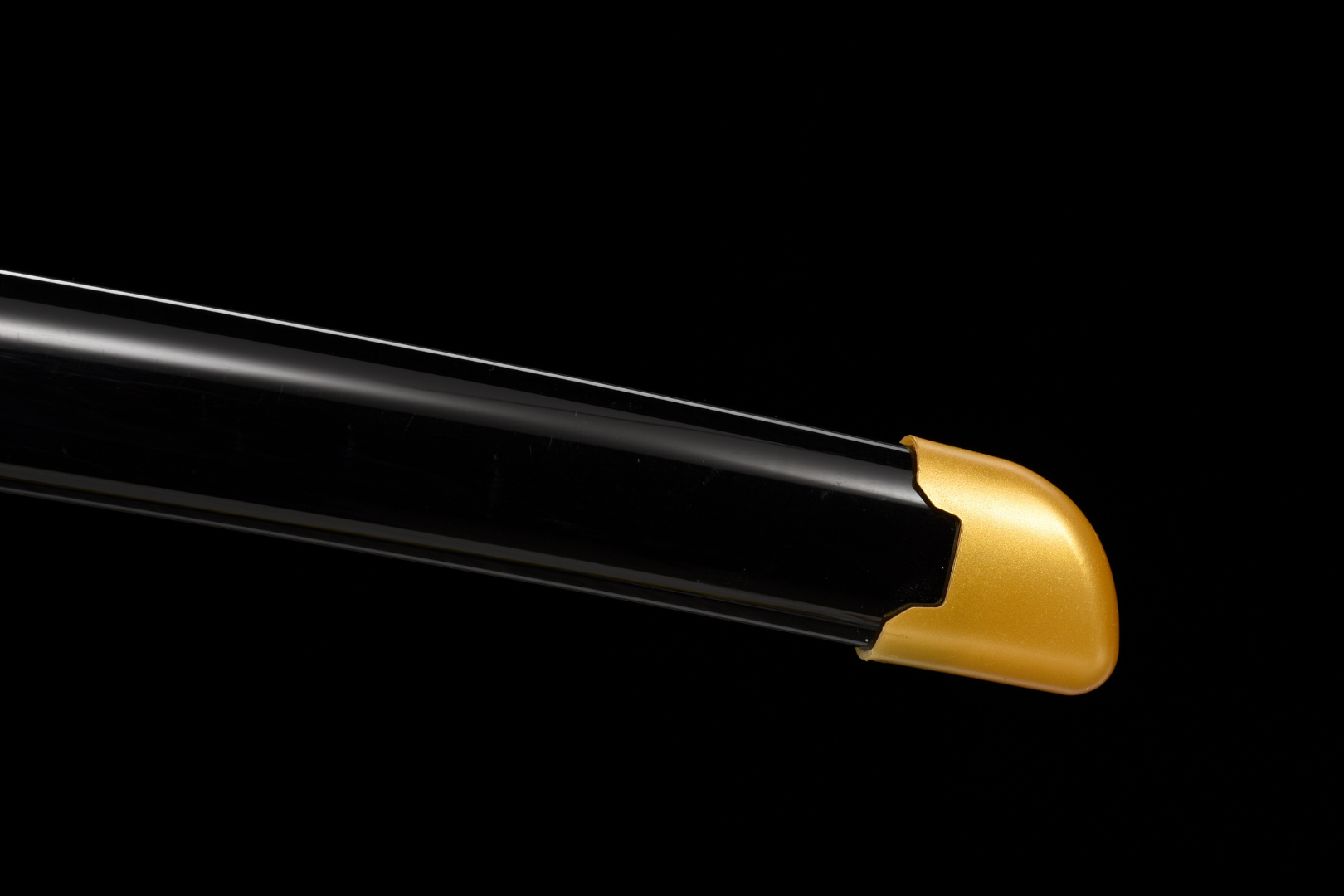Fourreau (Saya 鞘) — Un fourreau brillant Un saya noir orné de garnitures dorées complète cette réplique vivante et dynamique. Poignée (Tsuka 柄) : Recouverte de cuir marron et ornée de diamants dorés, elle assure une prise en main ferme et authentique, idéale pour les collectionneurs ou l’exposition.