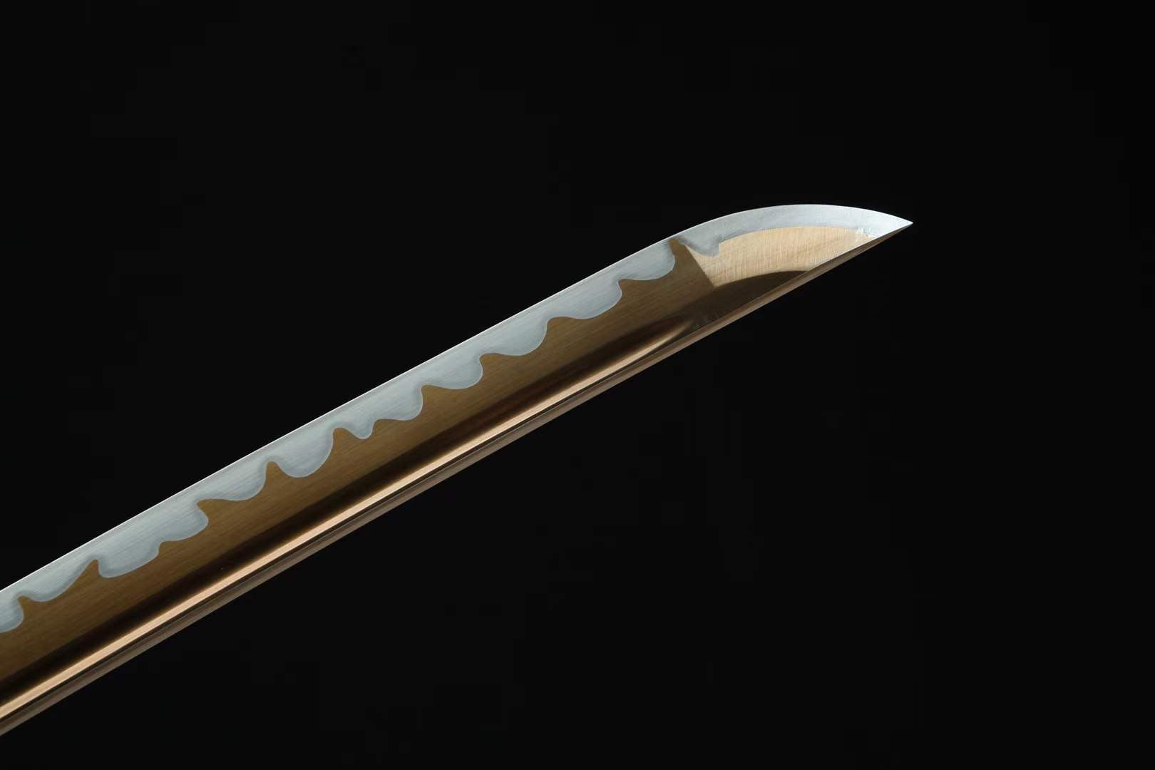 Le Kinrin Katana (金鱗刀), signifiant « Écailles d'or », est un hommage au raffinement et à la puissance. Avec sa ligne de trempe dorée scintillante et ses garnitures en cuivre finement travaillées, cette épée incarne à la fois l'artisanat traditionnel et le luxe moderne. Lame (刀身) : Forgée à la main en acier plié, trempée à l'huile et dorée pour révéler un hamon éclatant. Équilibre parfait pour la précision et la robustesse.