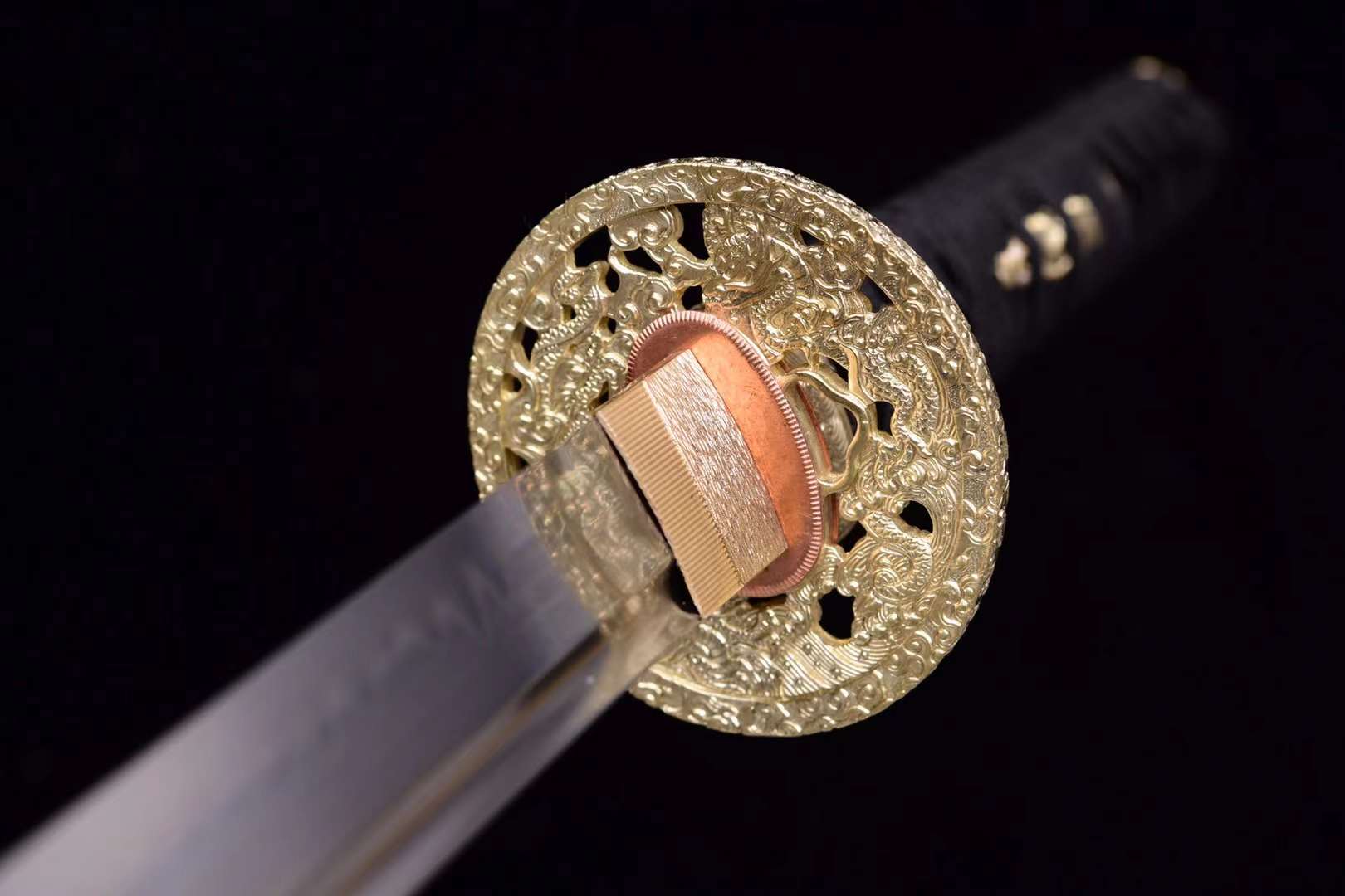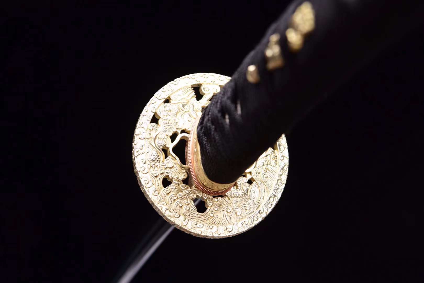 Poignée (Tsuka 柄) : Recouverte de soie noire traditionnelle sur du cuir de raie blanc, la tsuka offre une prise en main raffinée, rehaussée d'ornements dorés symbolisant la longévité et l'harmonie.
