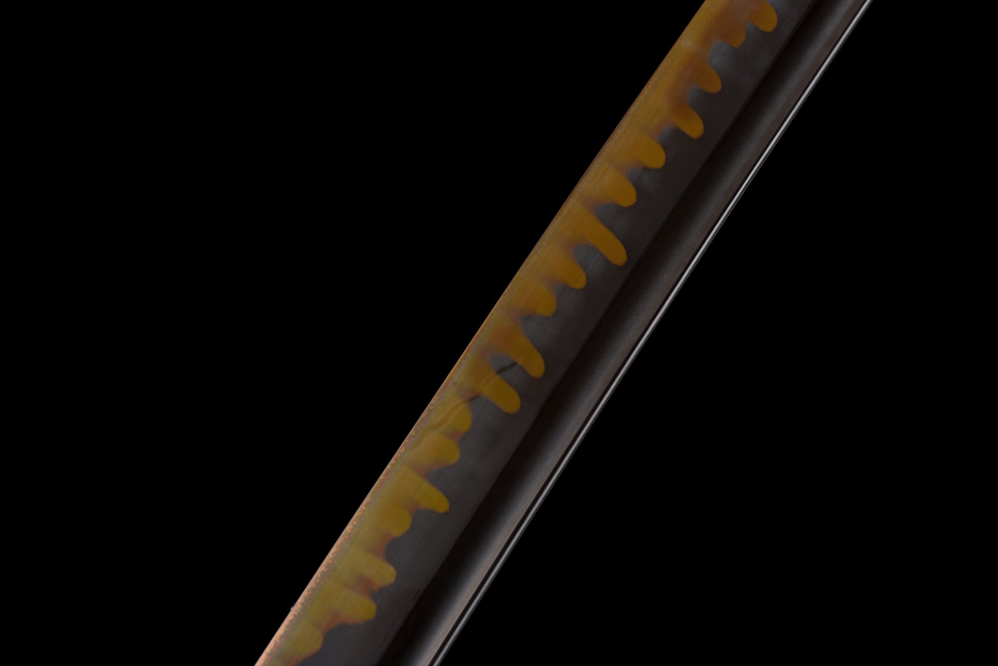 Lame (刀身) : Fabriquée en La lame en acier T10 présente une superbe finition sombre rehaussée d'un motif hamon doré. Le contraste entre l'ombre et la lumière confère à ce katana une aura de puissance ardente et de maîtrise sereine.