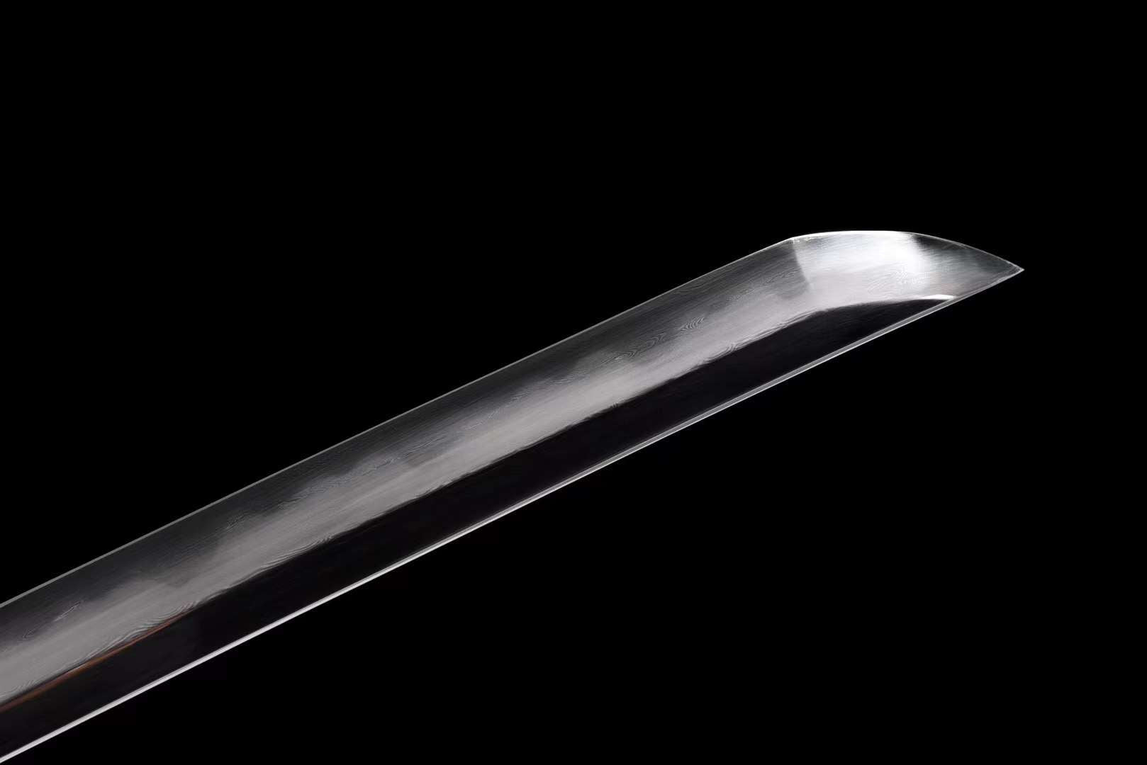 Le Kusanagi Katana (草薙刀) — « Épée coupante d’herbe » — s’inspire de la lame mythique des dieux japonais. Forgée en acier de Damas poli miroir et ornée d'un hamon visible, elle incarne la précision, l'équilibre et la divinité. Lame (刀身) : Damas forgé à la main, orné de motifs ondulés exquis et d'une ligne hamon raffinée, représentant la dualité du calme et de la force. Garde (Tsuba 鍔) : Tsuba en cuivre finement gravée, représentant des motifs anciens symbolisant le courage et la protection. Fourreau (Saya 鞘) : Saya en bois laqué vert vif, aux reflets mouchetés évoquant le jade, associé à un sageo noir pour le contraste. Poignée (Tsuka 柄) : Recouverte de coton noir sur du cuir de raie authentique, assurant une durabilité et un contrôle dignes de l'héritage d'un guerrier. Le Kusanagi Le katana est à la fois un chef-d'œuvre artistique et un hommage à la mythologie japonaise — une arme dont on croyait autrefois qu'elle commandait aux vents célestes.