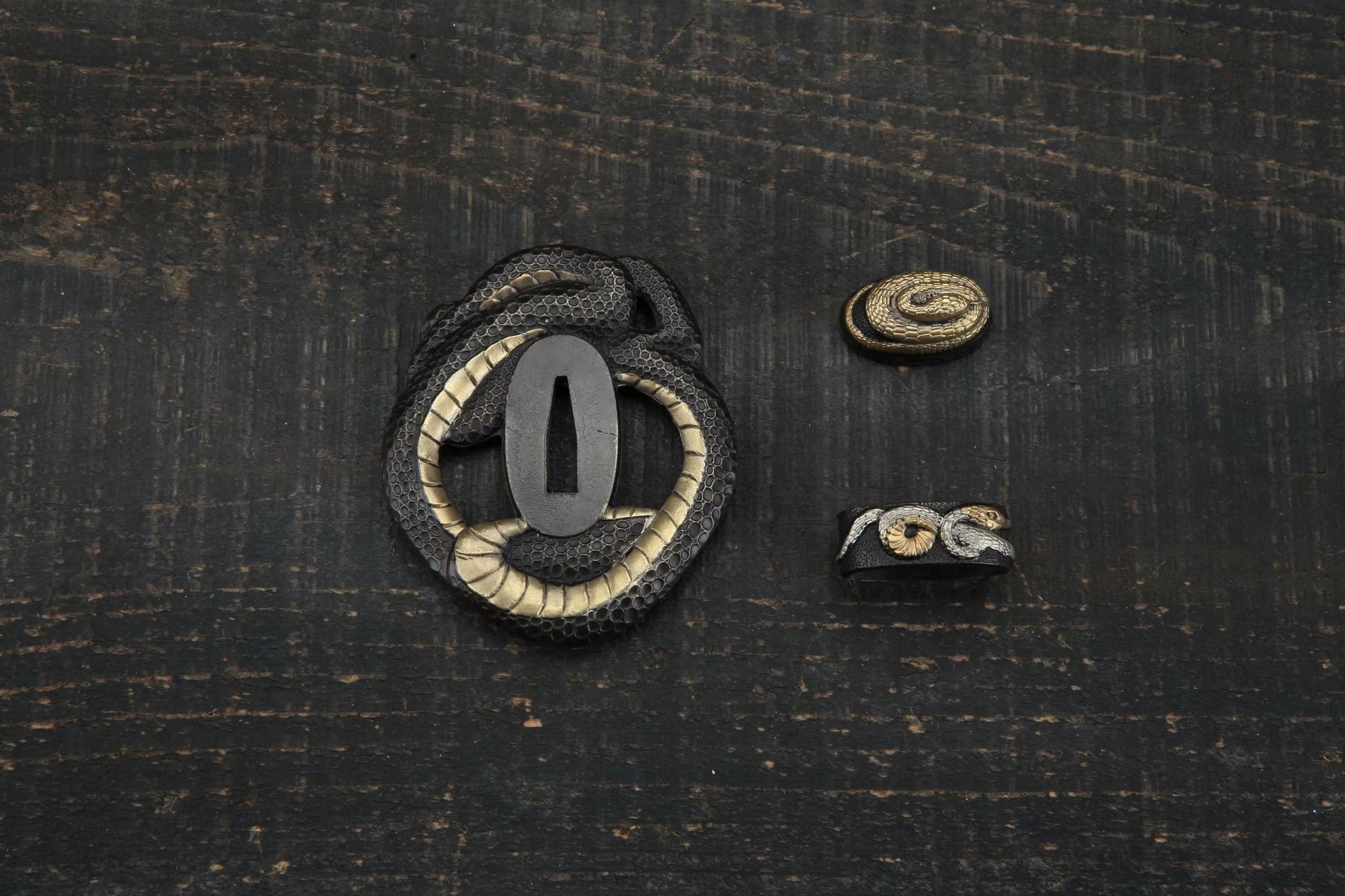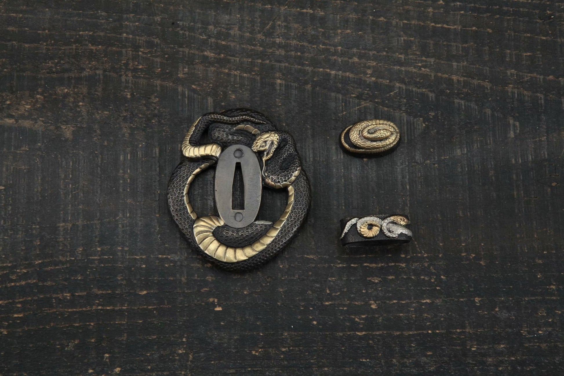 | Garnitures (Koshirae 拵) | Garnitures en cuivre tricolore (Or, argent, bronze) avec tsuba sculptée en forme de serpent |
