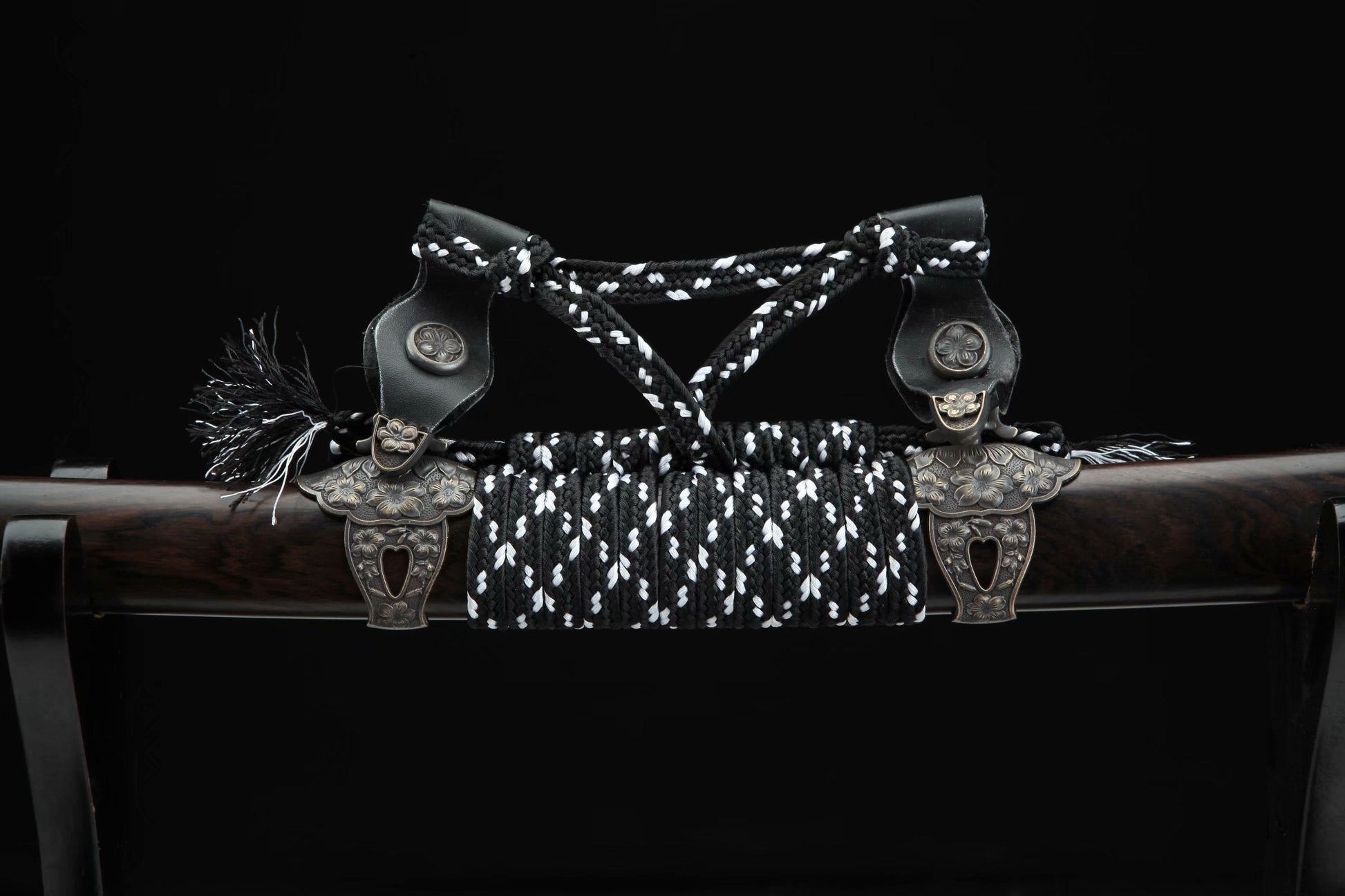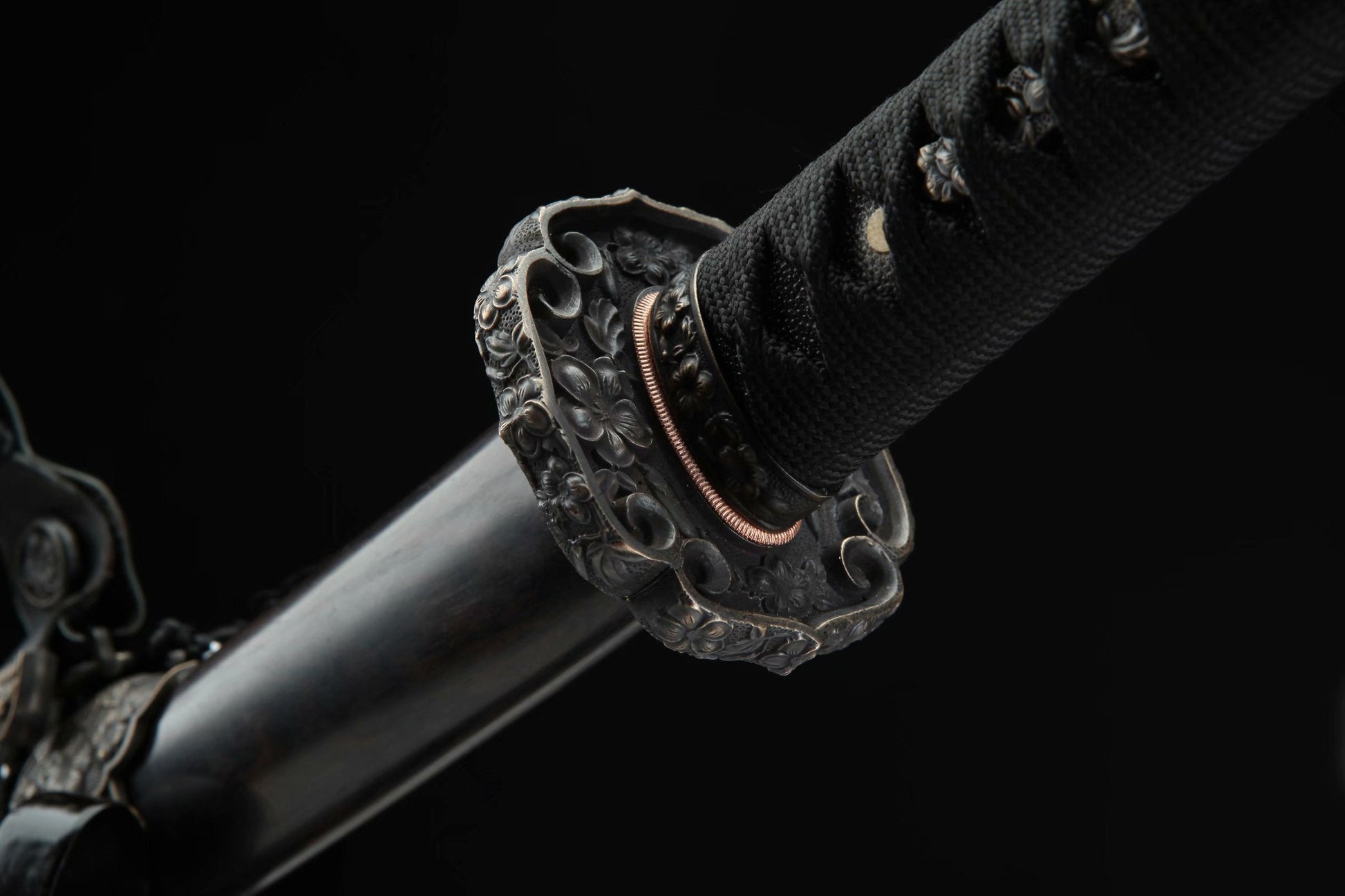 Fourreau (Saya 鞘) : Fabriqué en bois d'ébène poli avec des détails en cuivre sculpté, alliant luxe et robustesse.