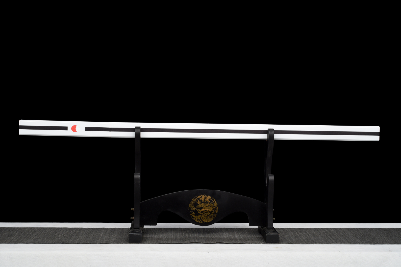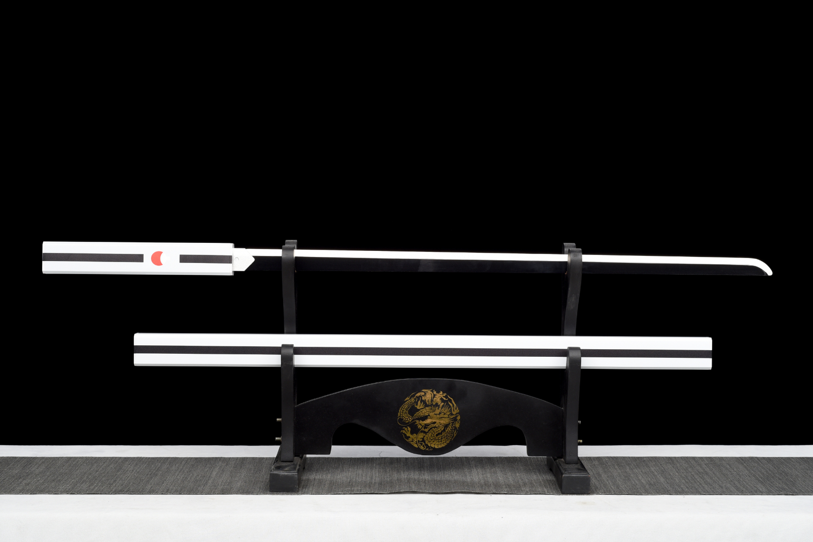 Fourreau (Saya 鞘) — Laqué blanc avec deux lignes noires et l'emblème rouge emblématique du clan Uchiha, représentant la fierté et Vengeance.