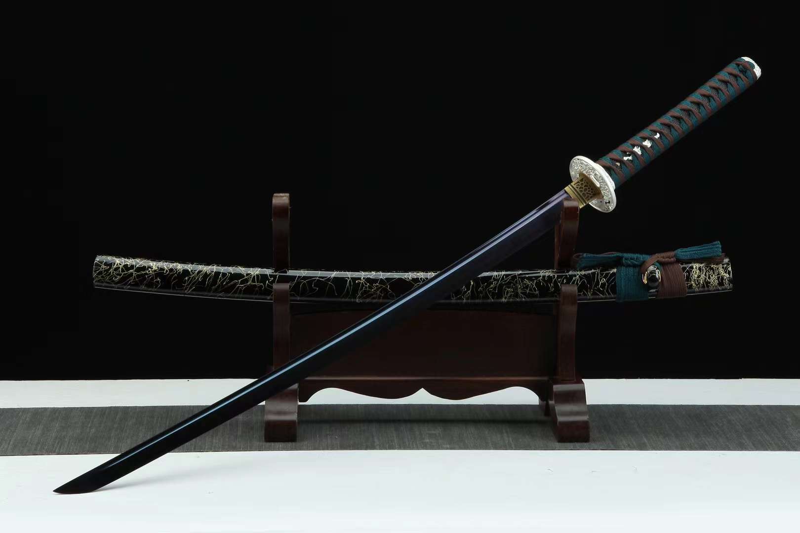 Fourreau (Saya 鞘) : La finition noire brillante du saya, rehaussée de stries dorées, symbolise le flux d'énergie et de vie, contrastant magnifiquement avec la lame bleue.