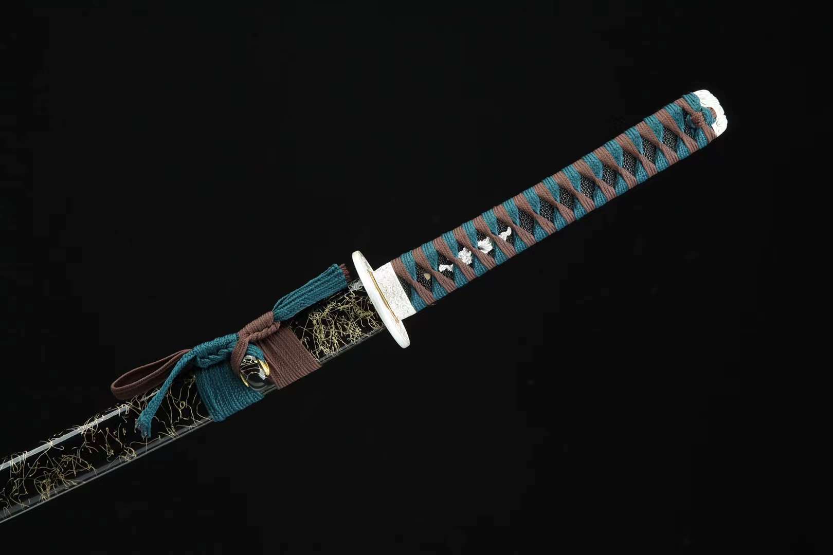 Poignée (Tsuka 柄) : La poignée est recouverte d'un riche revêtement brun et turquoise sur une âme en bois massif. assurant une prise en main confortable tout en s'harmonisant avec la palette de couleurs générale.