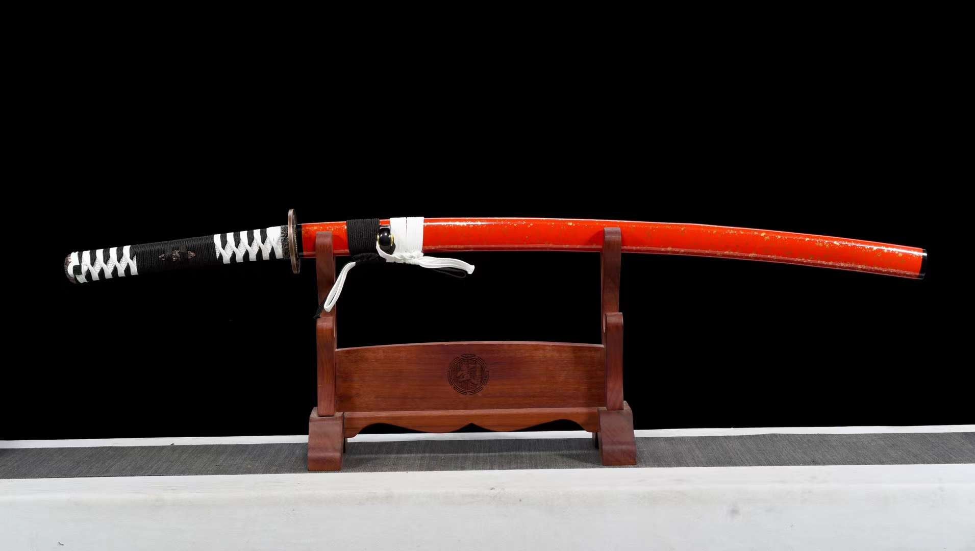 | Saya (fourreau) | Saya laqué rouge vermillon avec de subtils accents dorés et un cordon sageo noir et blanc |